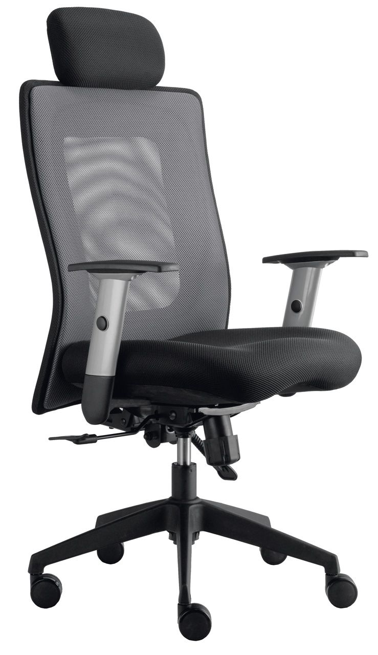Židle kancelářská, v základu černý sedák a síťový opěrák, područky v ceně. Mechanika e - synchrom, nylonový černý kříž. Nosnost 120 kg. Velikost 43 - 53cm.