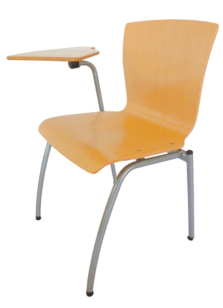 Židle konferenční pevná se sklopným pultem, dřevěné provedení. Svařovaná kovová konstrukce z trubkového profilu.