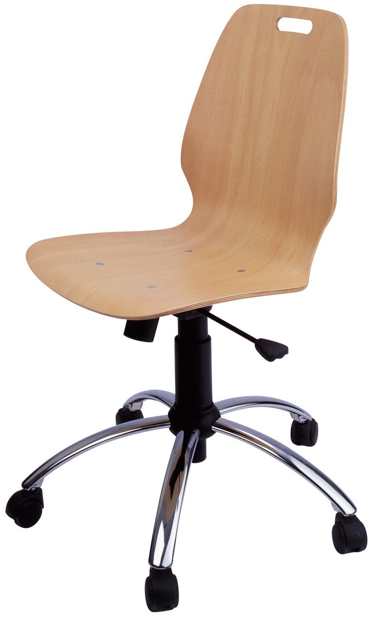 Židle učitelská výškově stavitelná na plynovém pístu, buková skořepina, chromový kříž na kolečkách nebo kluzácích. Dřevěné provedení. Korpus židle je vyroben z bukové překližky povrchově upravené polyuretanovým lakem a připevněné ocelovými nýty. Velikost 6. Nosnost 120kg. Možnosti provedení: čalouněná skořepina, částečně čalouněná skořepina.