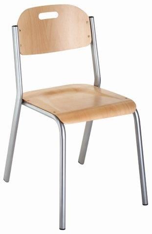Židle pevná stohovatelná s průhmatem. Vhodná do jídelen a školních družin. Svařovaná konstrukce z plochooválného a trubkového profilu. Sedák a opěrák z bukové překližky, povrchově upraven polyuretanovým lakem odolným proti vodě a připevněn ocelovými nýty. Povrchová úprava konstrukce je provedena práškovou vypalovanou barvou RAL. Možnosti: plastová, čalouněná nebo bez průhmatu. Nosnost 120 kg.