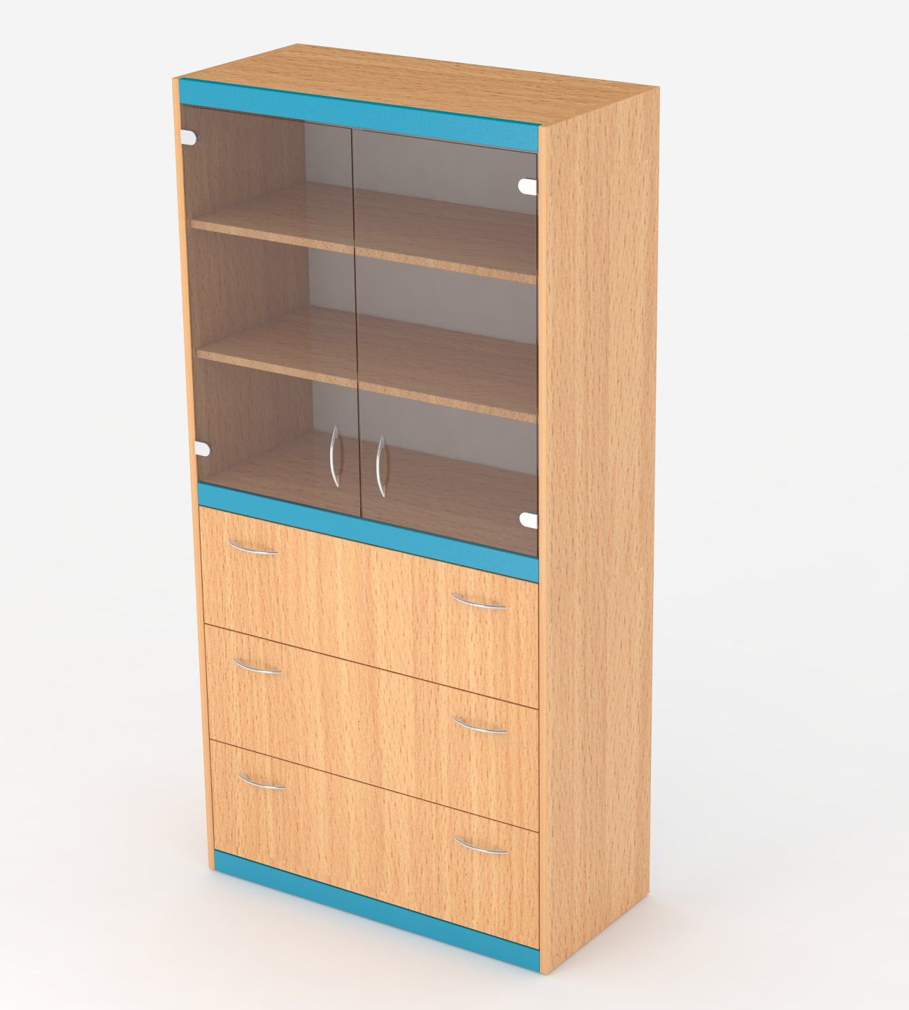 Dřevěná vysoká skříň s kovovou výstuhou, s policemi a prosklenými horními dvířky se zámkem a klíčem bez úchytu, se třemi zásuvkami ve spodní části s úchyty. Vhodná do kanceláří, kabinetů nebo ředitelny. Kovová výstuha je povrchově upravena práškovou vypalovací barvou RAL, která lze sladit s barvou stolů nebo židlí. Korpusy a zásuvky jsou vyráběny z materiálu LTD s ABS hranou v bukovém odstínu. Rozměr: 180 x 90 x 43 cm.