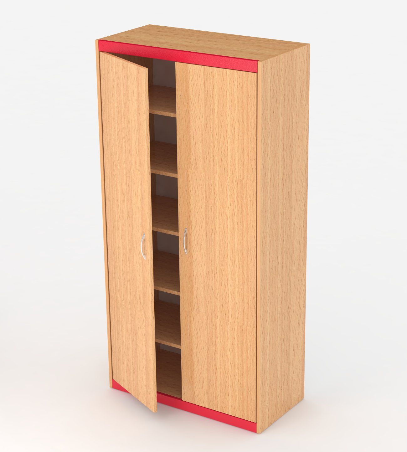 Dřevěná vysoká skříň dvoudveřová s kovovou výstuhou a policemi. Vhodná do kanceláří, kabinetů nebo ředitelny. Kovová výstuha je povrchově upravena práškovou vypalovací barvou RAL, která lze sladit s barvou stolů nebo židlí. Korpusy a dveře jsou vyráběny z materiálu LTD s ABS hranou v bukovém odstínu. Rozměr: 180 x 90 x 43 cm.