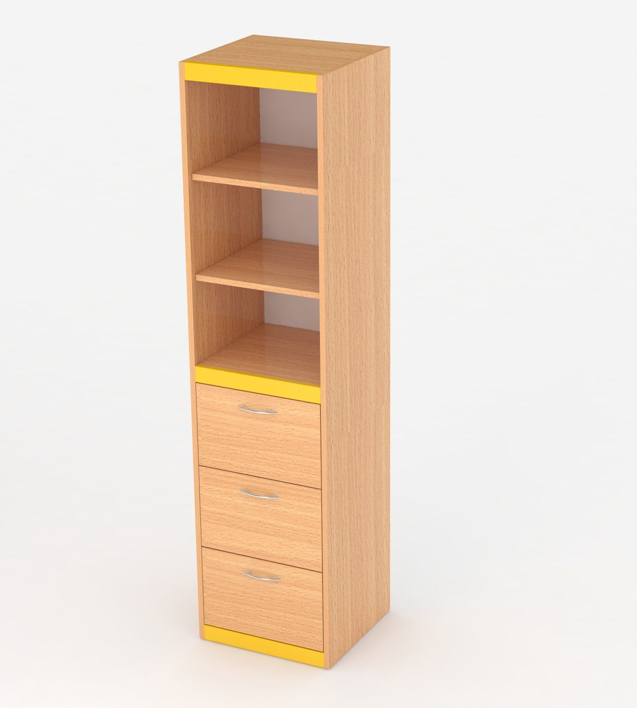 Dřevěná úzká skříň s kovovou výstuhou, kombinovaná se zásuvkami ve spodní části a policemi. Vhodná do kanceláří, kabinetů nebo ředitelny. Kovová výstuha je povrchově upravena práškovou vypalovací barvou RAL, která lze sladit s barvou stolů nebo židlí. Korpusy a zásuvky jsou vyráběny z materiálu LTD s ABS hranou v bukovém odstínu. Rozměr: 180 x 45 x 43 cm.