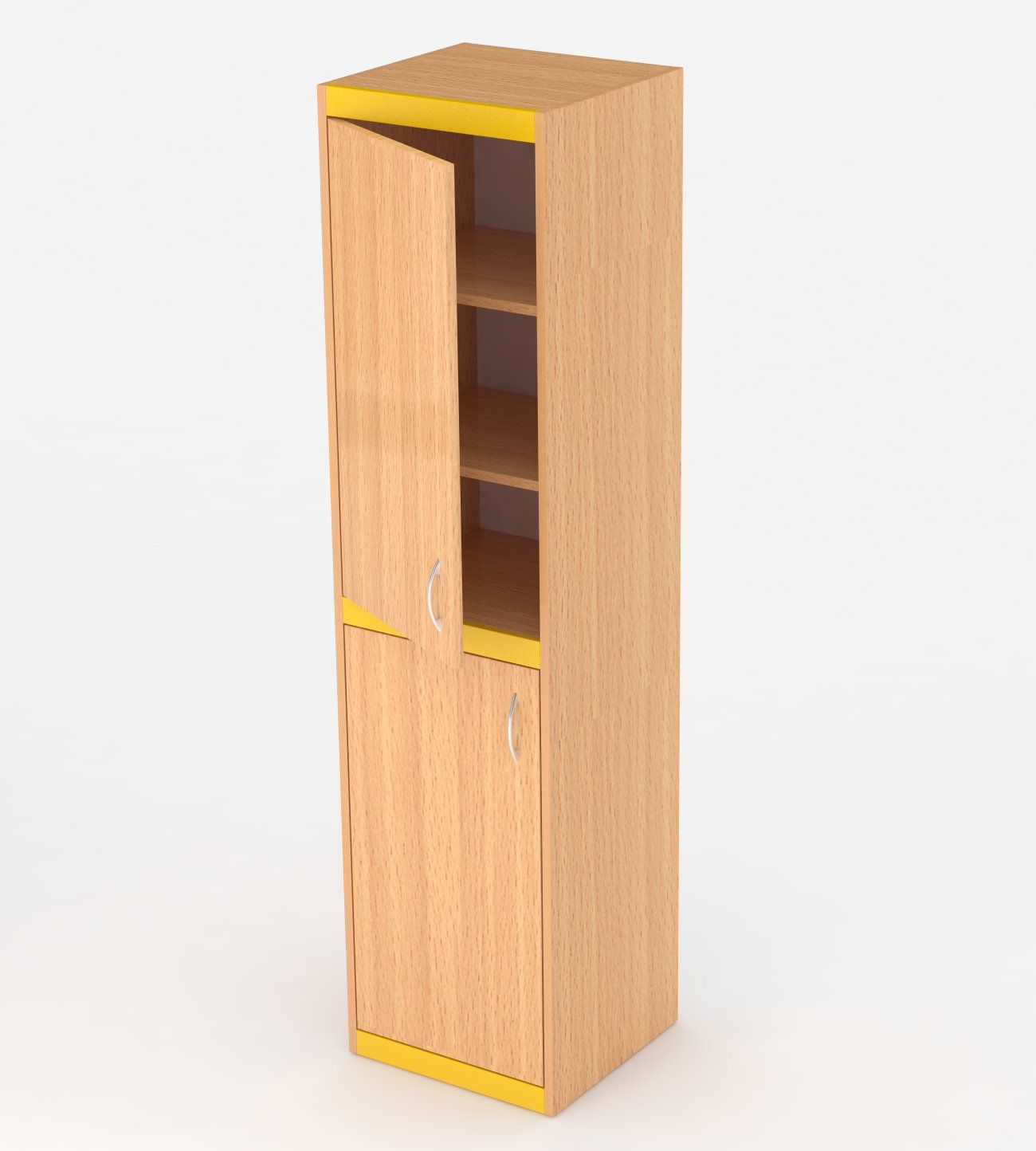 Dřevěná úzká skříň s kovovou výstuhou, s dvířky a policemi. Vhodná do kanceláří, kabinetů nebo ředitelny. Kovová výstuha je povrchově upravena práškovou vypalovací barvou RAL, která lze sladit s barvou stolů nebo židlí. Korpusy a dvířka jsou vyráběny z materiálu LTD s ABS hranou v bukovém odstínu. Rozměr: 180 x 45 x 43 cm.