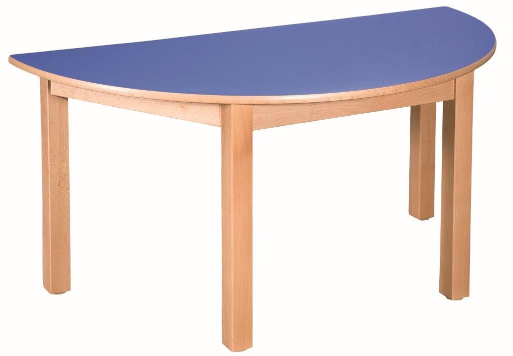 Stůl celodřevěný, půlkulatý s barevnou pracovní plochou. Vhodný pro děti do družin a mateřských škol. Při konstrukci byl kladen maximální důraz na stabilitu, variabilitu a pevnost. Stolová podnož je vyrobena z bukového masivu. Pracovní plocha umakart barevná. Všechny hrany jsou zaoblené. Dřevo je povrchově upraveno polyuretanovým lakem odolným proti oděru a vodě. Deska tl.18mm. Rozměr: 120 x 60cm. Velikosti: 2, 3, 4, 5, 6.