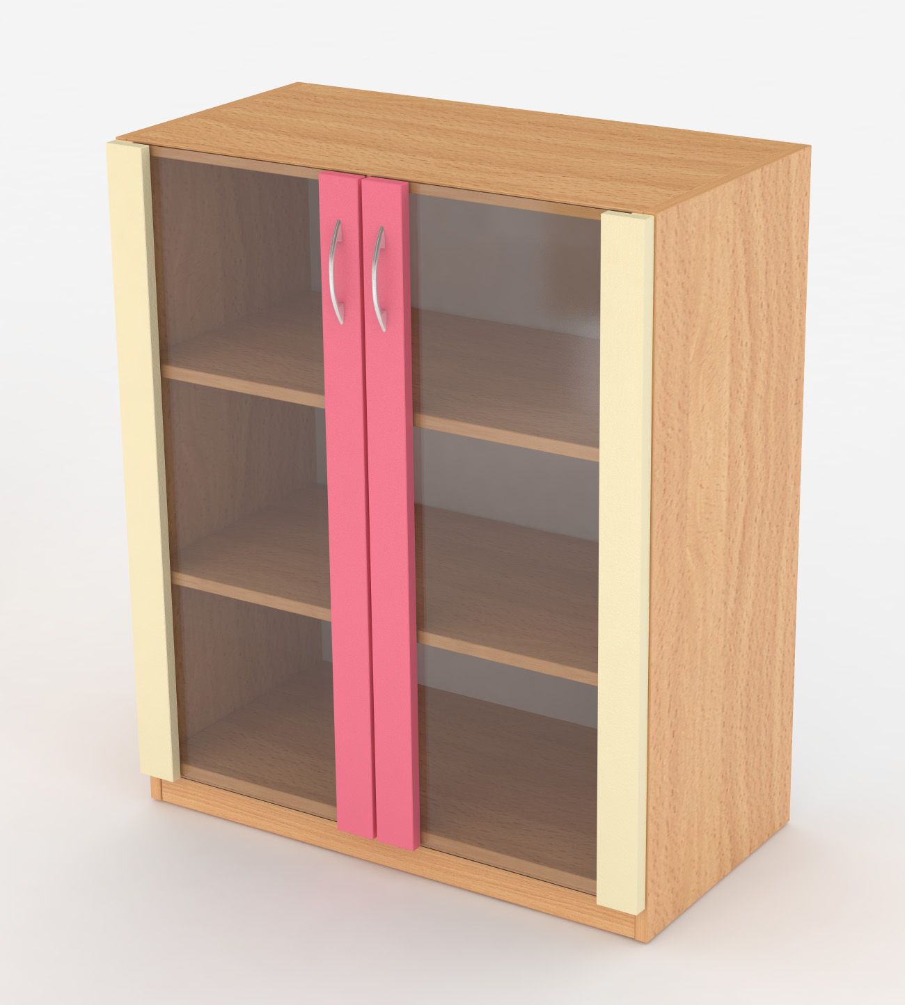 Dřevěná skříň s policemi a barevnými částečně prosklenými dvířky s úchyty. Vhodná do kanceláří, kabinetů nebo ředitelny. Barevná dvířka lze sladit s barvou okolí. Korpusy a dvířka jsou vyráběny z materiálu LTD s ABS hranou v bukovém odstínu. Rozměr: 95 x 80 x 40 cm. Barevné provedení uveďte do poznámky u objednávky.