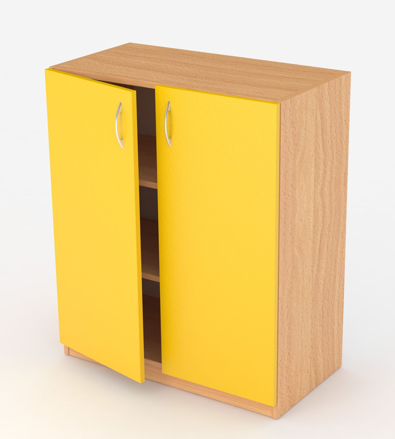 Dřevěná skříň s policemi a barevnými dvířky a s úchyty. Vhodná do kanceláří, kabinetů nebo ředitelny. Barevná dvířka lze sladit s barvou okolí. Korpusy a dvířka jsou vyráběny z materiálu LTD s ABS hranou v bukovém odstínu. Rozměr: 95 x 80 x 40 cm. Barevné provedení uveďte do poznámky u objednávky.