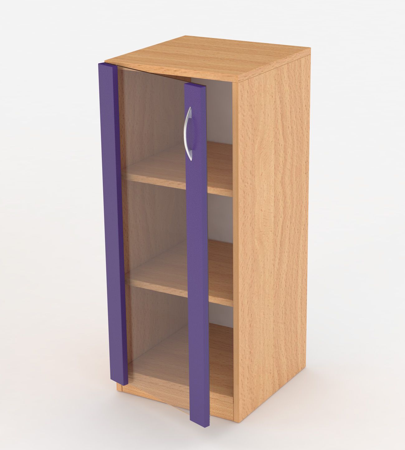 Dřevěná skříň s policemi a barevnými částečně prosklenými dvířky s úchyty. Vhodná do kanceláří, kabinetů nebo ředitelny. Barevná dvířka lze sladit s barvou okolí. Korpusy a dvířka jsou vyráběny z materiálu LTD s ABS hranou v bukovém odstínu. Rozměr: 95 x 40 x 40 cm. Barevné provedení uveďte do poznámky u objednávky.