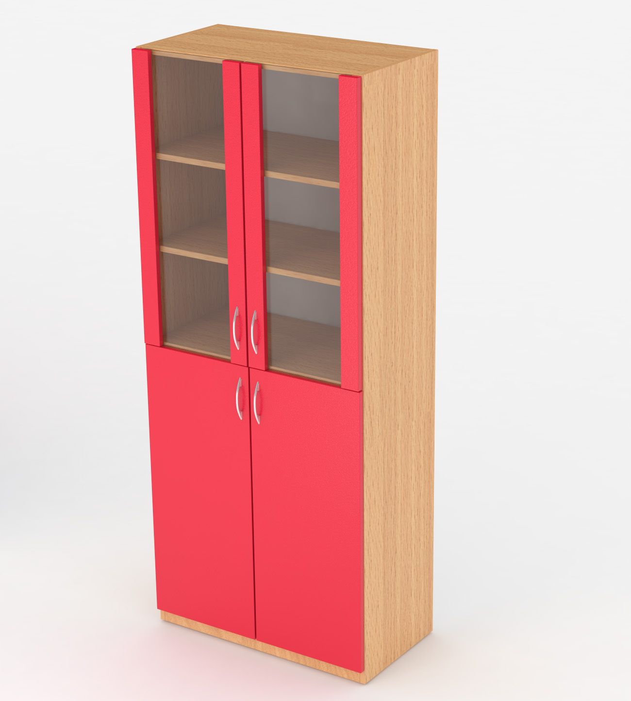 Dřevěná skříň s policemi a barevnými dvířky-ve spodní části celodřevěné a v horní části částečně prosklené, s úchyty. Vhodná do kanceláří, kabinetů nebo ředitelny. Barevná dvířka lze sladit s okolím. Korpusy a dvířka jsou vyráběny z materiálu LTD s ABS hranou v bukovém odstínu. Rozměr: 185 x 80 x 40 cm. Barevné provedení uveďte do poznámky u objednávky.