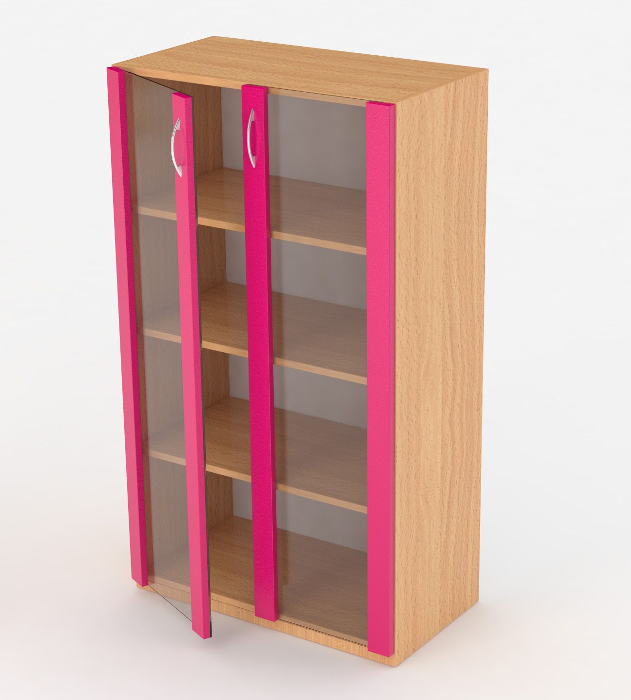 Dřevěná skříň s policemi a barevnými částečně prosklenými dvířky s úchyty. Vhodná do kanceláří, kabinetů nebo ředitelny. Barevná dvířka lze sladit s barvou okolí. Korpusy a dvířka jsou vyráběny z materiálu LTD s ABS hranou v bukovém odstínu. Rozměr: 135 x 80 x 40 cm. Barevné provedení uveďte do poznámky u objednávky.